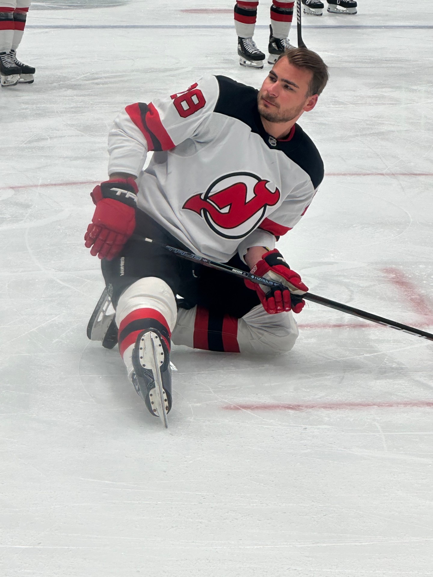 Timo Meier, Jessica’s number one player, warming up on March 4, 2025 to play against the Dallas Stars. He scored a goal in that game.