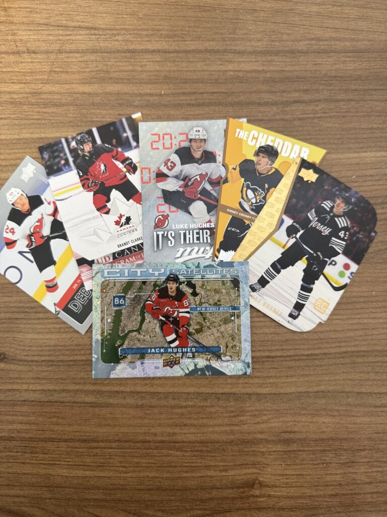 Cards that Jessica Schieber considers to be some of her favorite cards that she has collected over the past two years. The most recent card she has in this display is the City Satellites Jack Hughes card (on the bottom). (Photo by Jessica Schieber)