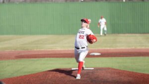 No. 22, Trey Barkman, a right handed pitcher, pitches in past game against New Mexico Highlands University.