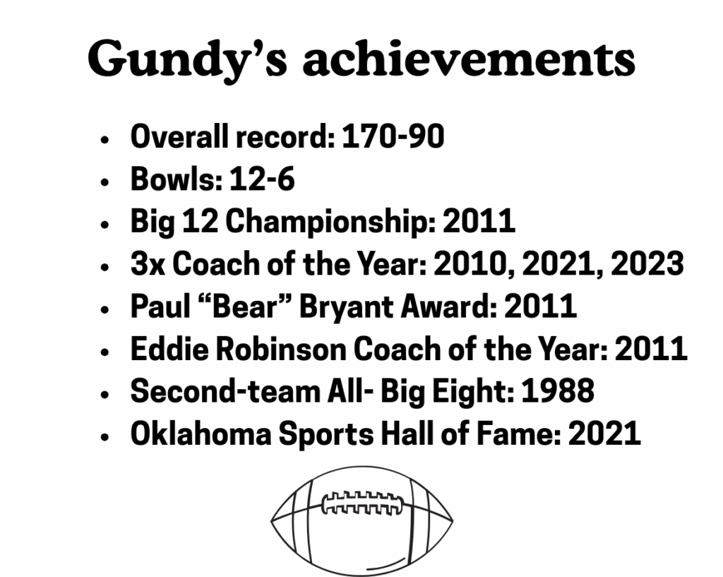 Gundy had a lot of accomplishments as a coach. His overall record was 170-90 in 21 seasons. He had eight 10-win seasons, he held National Coach of the Year awards in 2011 he was given both the Paul “Bear” Bryant Award and the Eddie Robinson Award. He was Big 12 Coach of the Year three times; these took place in 2010, 2021 and 2023. He won the 2011 Big 12 Championship and has finished in the Top 10 ranking 11 times.