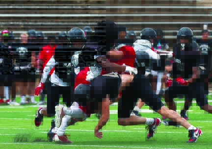 The Ranger defenders tackle quarterback, Gunner McElroy, during the scrimmage game played Saturday at Ranger Field.